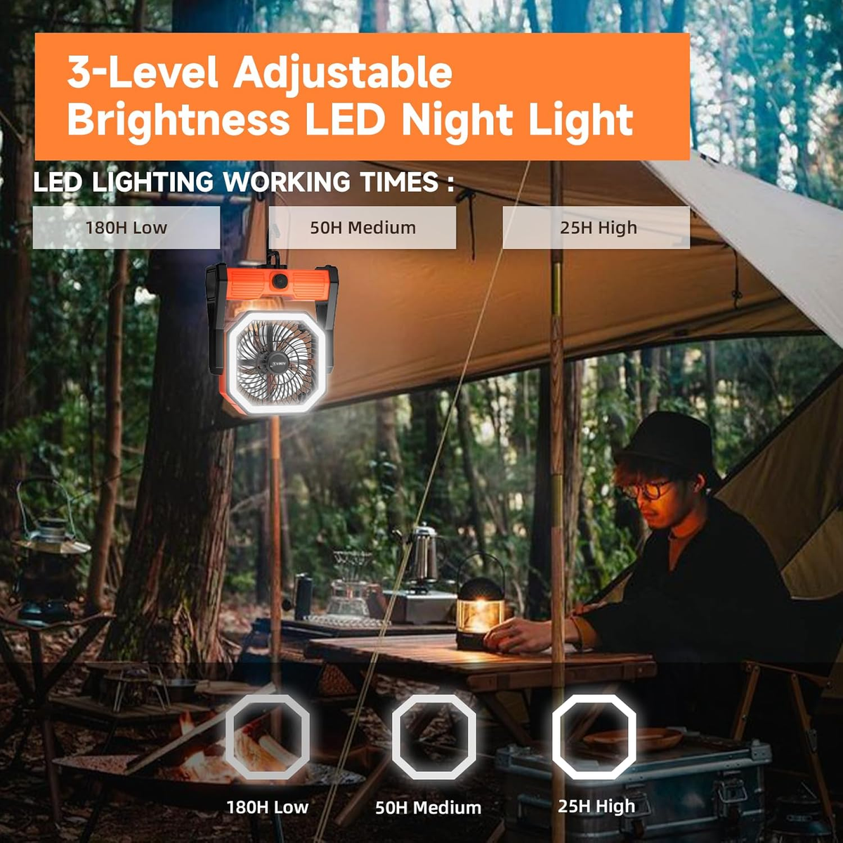 Wherever you are, the AIMAX Portable Camping Fan keeps you cool, bright, and connected. It's the perfect companion for outdoor travel, home, office, or emergency use. This multi-functional fan cleverly integrates a powerful fan, an adjustable LED night light, and a high-capacity power bank, designed to provide comfort and convenience in any situation.