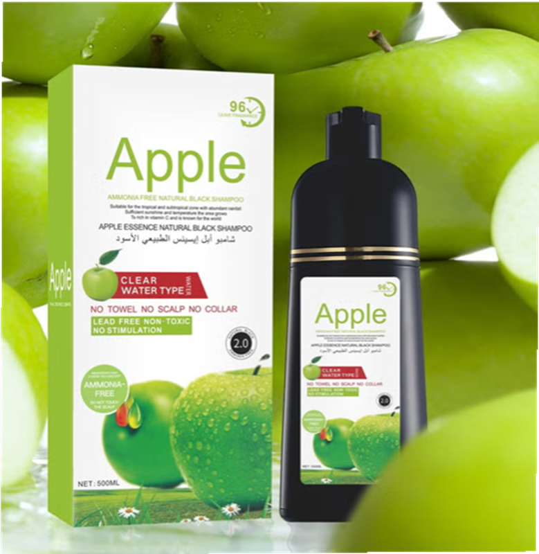 Apple Natural Ammonia-Free Hair Coloring Shampoo 500ml. This organic black hair coloring shampoo contains ginseng hair coloring agents to effectively cover gray hair.