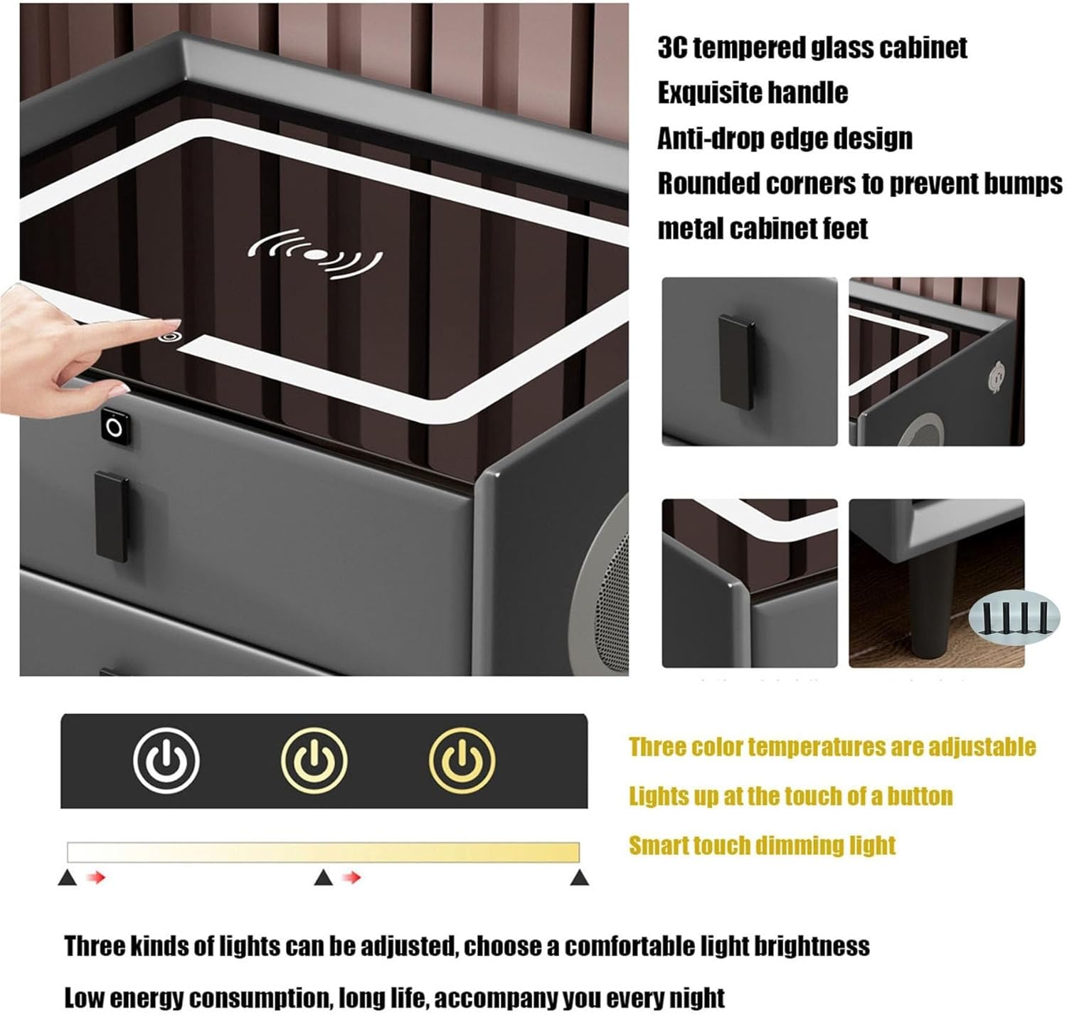 Smart Nightstand: The entire cabinet has been newly upgraded, fully upholstered in leather, the cabinet drawers are made entirely of solid wood, and the drawer runners have been thickened and widened. The smart nightstand uses a 3C tempered glass desktop that is wear and scratch resistant, beautiful and stylish, and easy to clean. It can be assembled by yourself and includes all necessary hardware and instructions.