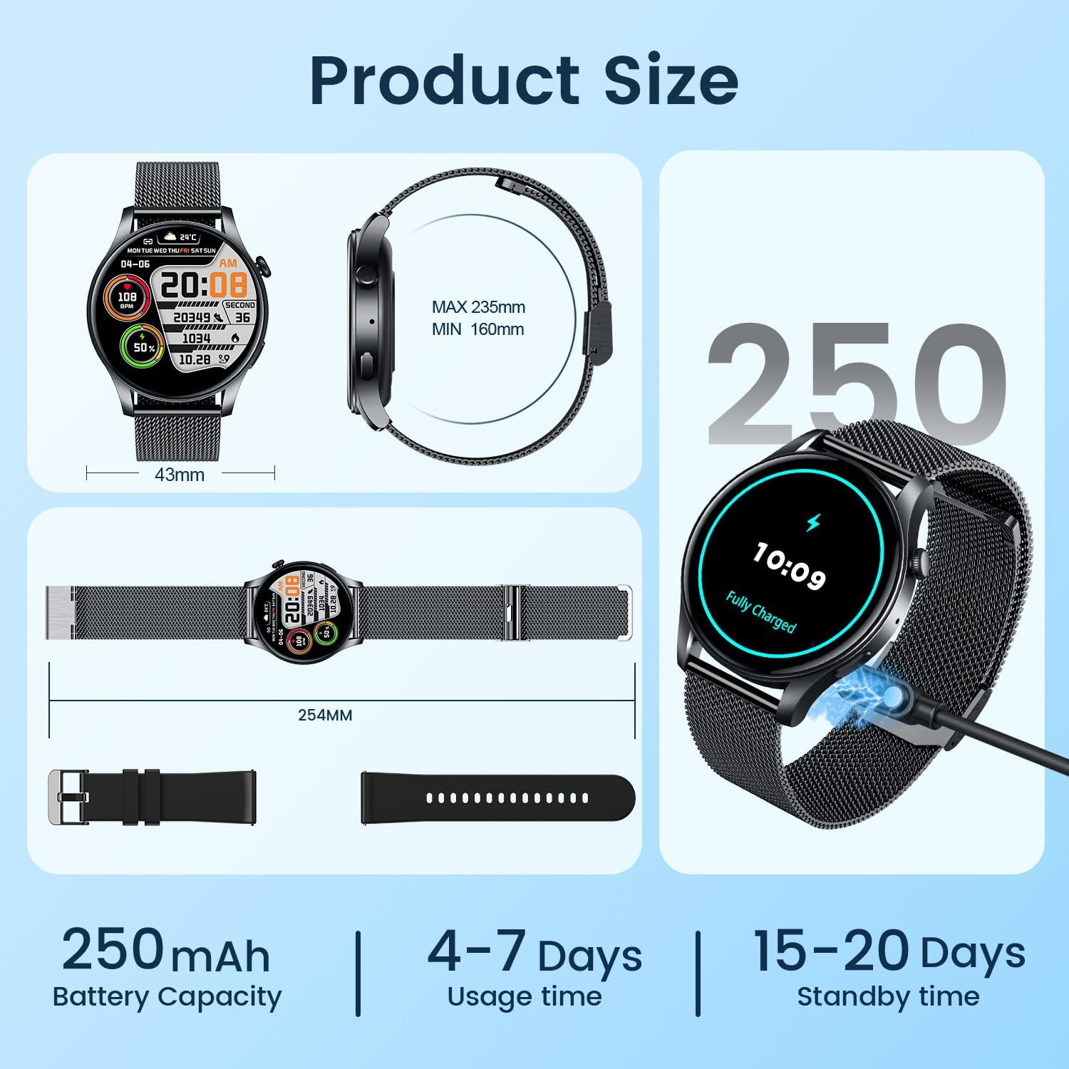 ⌚Easy ato charge: the smartwatch comes with a magnetic charger, built-in 250mAh battery, 1.5 hours charging can be used for about 4-7 days.