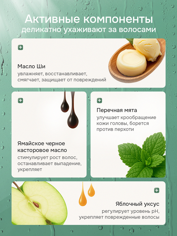 Omega-9 fatty acids in apple cider vinegar, black vinegar, and castor oil provide essential nutrients, strengthening and repairing brittle hair while reducing hair loss. Peppermint leaf extract and ricinoleic acid have natural antibacterial properties. It removes sebum and impurities from the scalp, gently combats dandruff, and leaves a light, healing fragrance. It's especially suitable for damaged hair that's frequently color-treated.